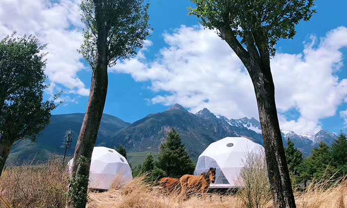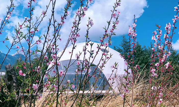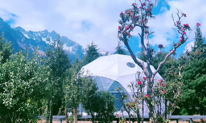 4、搭建周期短:獨(dú)特的網(wǎng)殼結(jié)構(gòu)使球形帳篷搭建相當(dāng)簡單便捷,一個(gè)10米直徑的球形帳篷(78平方米)只需5個(gè)人花幾小時(shí)就可以搭建完成,甚至可實(shí)現(xiàn)遷移再造,具備靈活可移動性!