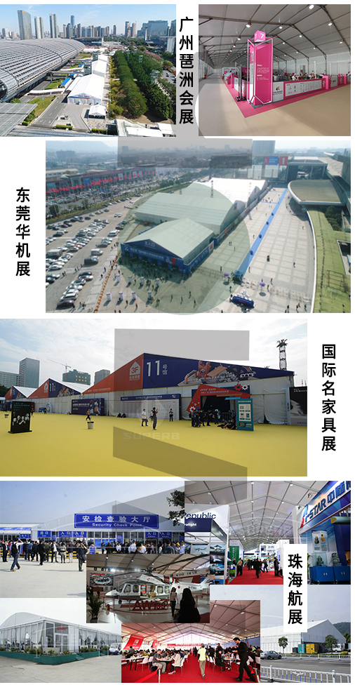 我司嚴(yán)格執(zhí)行ISO9001的質(zhì)量管理體系,確保不良產(chǎn)品的最小化及客戶滿意度的最大化。我們的的主要產(chǎn)品包括可移動的模塊化鋁合金支架篷房,有不同風(fēng)格的篷房及裝飾可供選擇,篷房跨度從3米到60米。此外,還包括錐頂篷房和吊頂篷房,以及篷房配件,如照明燈具、地板、空調(diào)、桌椅及其它用于篷房內(nèi)部的家具。篷房可廣泛應(yīng)用于大小型活動、婚慶、展會、體育、酒店、航空和工業(yè)等其它領(lǐng)域。篷房框架結(jié)構(gòu)為高強(qiáng)度鋁合金6061/T6型材,篷布為防水、阻燃的雙面PVC涂層聚酯纖維布,主體結(jié)構(gòu)風(fēng)載荷不少于100Km/h。