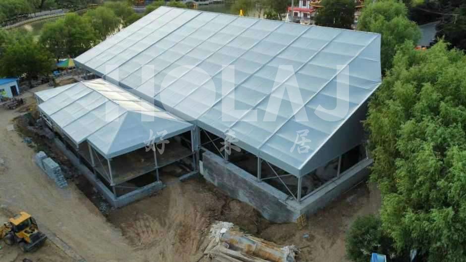 好來居篷房采用坡屋面鋁合金篷房結(jié)構(gòu)形式搭建了40*55*3.3異形主體篷房和10*25*3.3入口門廊,對(duì)考古現(xiàn)場(chǎng)進(jìn)行覆蓋保護(hù)。建筑形式為裝配式人字頂篷房,由若干鋁合金管材和鋼結(jié)構(gòu)節(jié)點(diǎn)板拼接成骨架,外面罩以膜材形成。